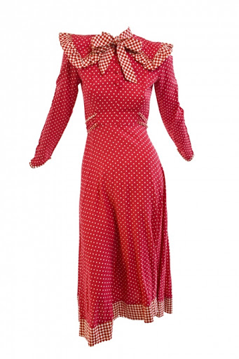 Fab red polka dot example. This red polka dot was a signature of Miss Mouse designs and often featured on the linings of Rae-Cullen’s garments.